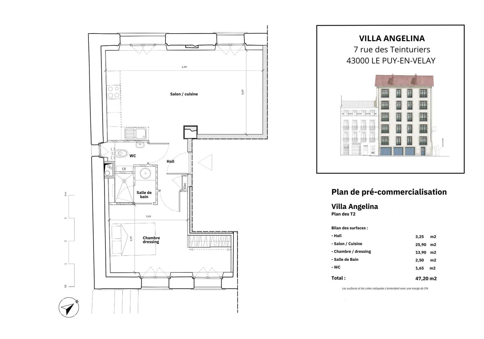 Votre agence Côte Particuliers Le Puy-en-Velay, vous propose en exclusivité : En plein coeur du Puy-en-Velay, à proximité immédiate de toutes commodités, dans la future résidence VILLA ANGELINA avec ascenseur : Nous vous proposons un appartement T2 au troisième étage d'une superficie de 47.20 m² se composant d'un hall d'entrée, d'un salon/cuisine d'une superficie de 25.90 m², d'une chambre avec dressing de 13.90 m², d'une salle d'eau et d'un WC séparé. Prestations : - Chauffage individuel par radiateurs électriques - Menuiseries double vitrage : aluminium extérieur et PVC intérieur - Parquet flottant dans toutes les pièces et sol souple dans la salle d'eau avec faïence au mur - Stores intérieurs occultants - Cuisine à prévoir uniquement Achat en vente achevée - FRAIS DE NOTAIRE REDUITS 148 000 € Frais d'agence inclus 142 307,69 € Hors honoraires d'agence 5 692,31 € Frais d'agence TTC