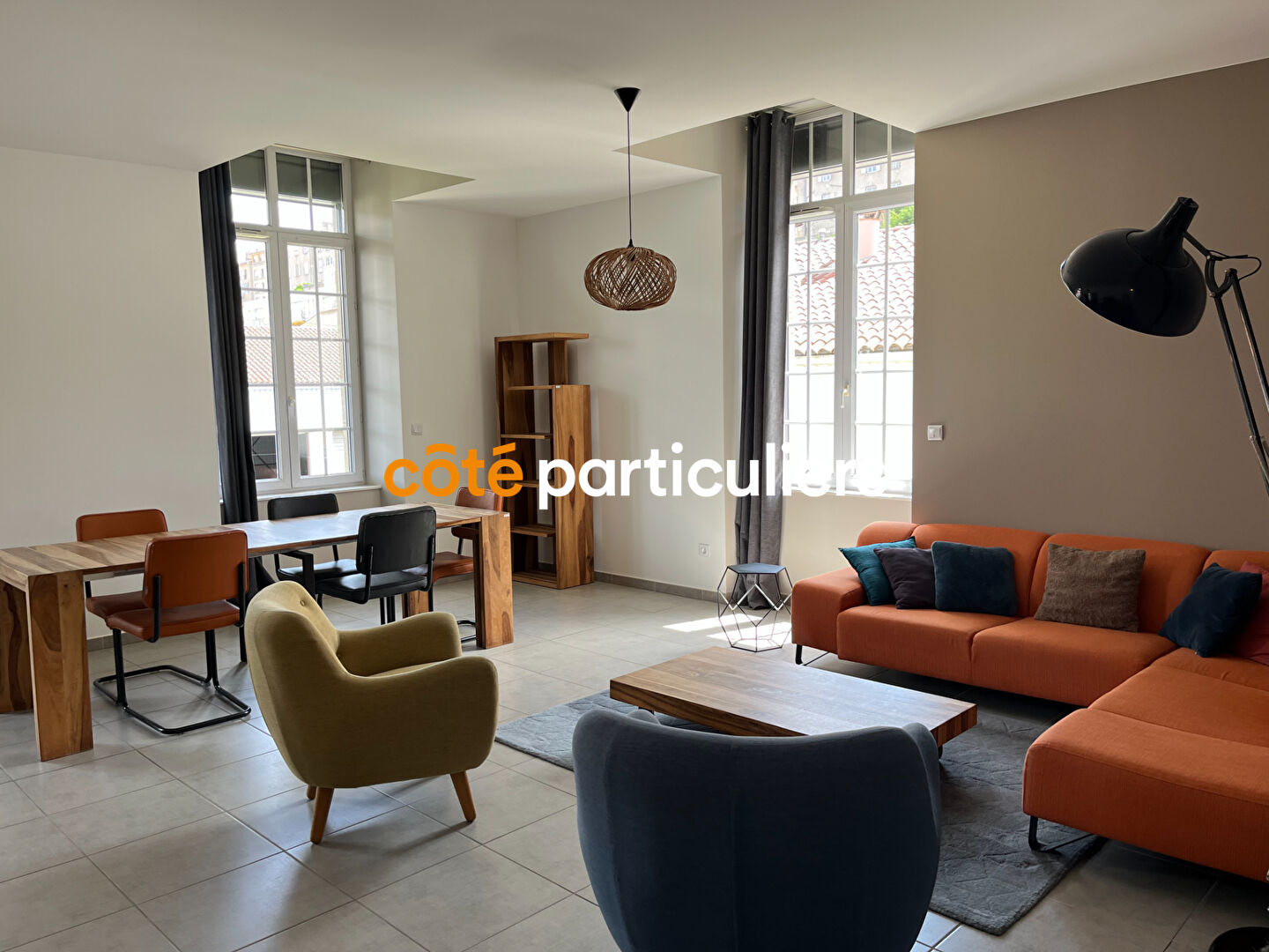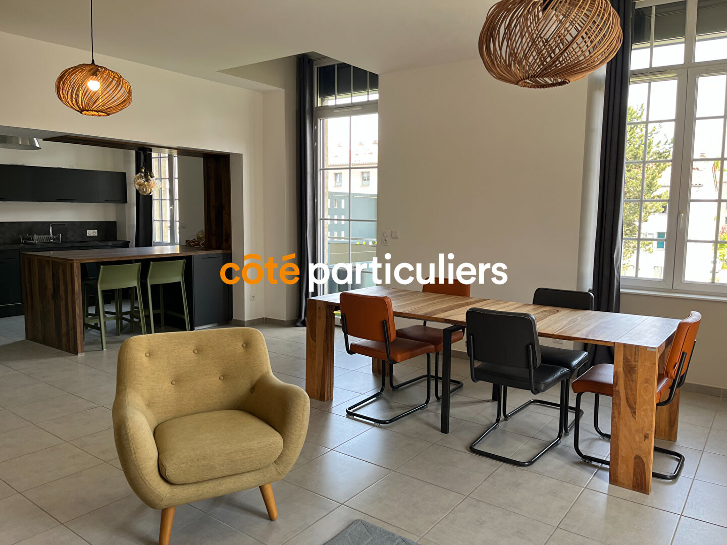 Côté Particuliers Le Puy-en-Velay, vous propose à la location meublée : Cet appartement de type T4 de 117 m² au premier étage avec ascenseur, très lumineux avec triple orientation (est-sud-ouest), terrasse de 14 m² et deux stationnements. Dans la résidence LE PARC BELLAVIA, Place de la Libération au Puy situé à proximité immédiate du centre-ville du Puy-en-Velay, nous vous proposons à la location ce T4 en parfait état et très bien agencé. Il se compose : d'un salon/séjour ouvert sur la cuisine équipée donnant sur le cellier ainsi que sur la terrasse de 14 m² avec vue sur les monuments historiques du Puy, d'un dégagement desservant deux chambres avec placards, une salle d'eau avec meuble double vasques et toilettes, un troisième chambre avec sa propre salle d'eau et des toilettes séparées. Disponible immédiatement En annexe : une place de stationnement en extérieur et une place de stationnement en souterrain Chauffage gaz de ville par plancher chauffant Loyer : 1 317 € par mois dont 117 € de provisions de charges pour les charges de copropriété récupérables, la taxe d'enlèvement des ordures ménagères et l'entretien annuel de la chaudière Honoraires à la charge du locataire TTC : 600 € dont 400 € pour l'état des lieux Dépôt de garantie : 2 400 €