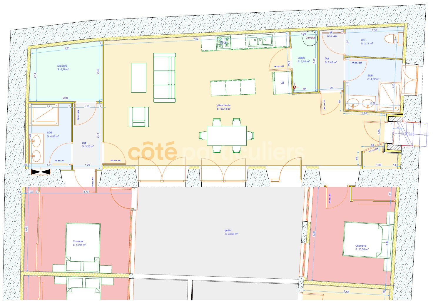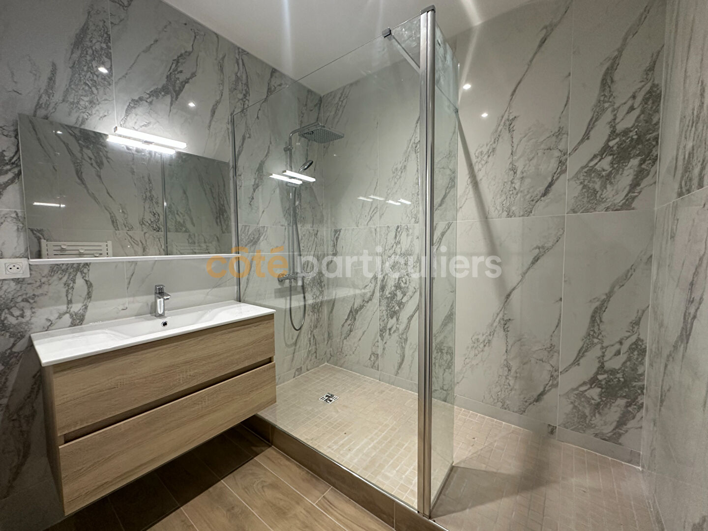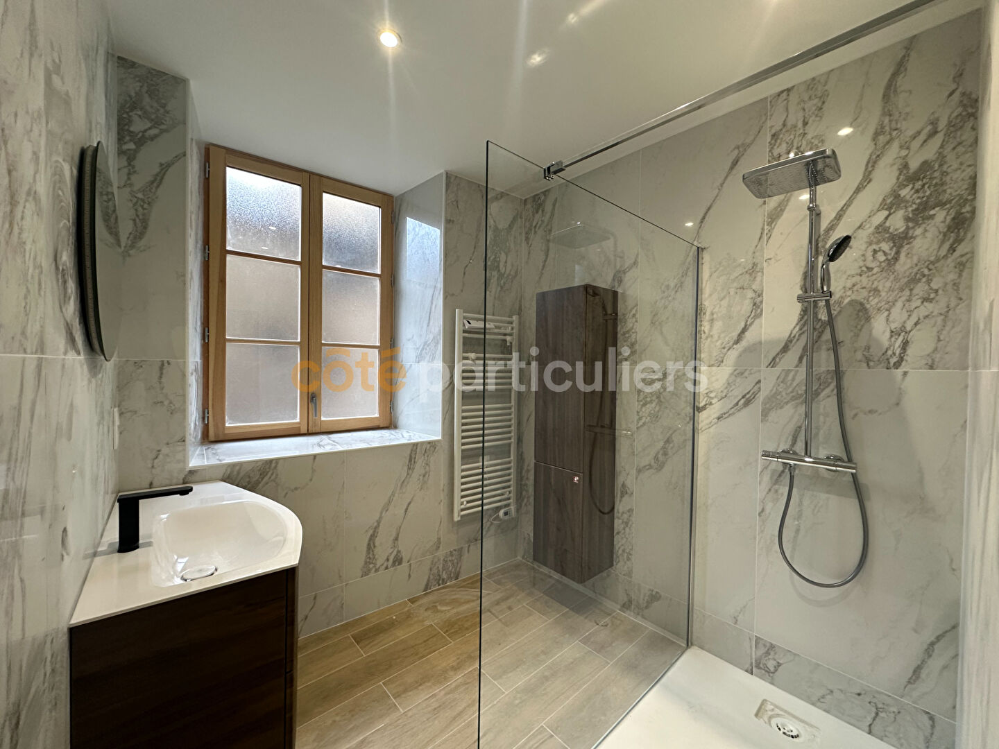 Votre agence Côté Particuliers Le Puy-en-Velay, vous propose : Ce bel appartement T3 entièrement rénové de 105 m² situé en centre-ville du Puy-en-Velay avec garage et entrée indépendante. Il se compose d'un hall d'entrée avec placard donnant sur un vaste séjour lumineux avec cuisine entièrement équipée et aménagée avec accès à une belle terrasse de 24 m², un cellier, une suite parentale avec une grande chambre de 15 m² donnant sur la terrasse, une salle d'eau et un dressing, une seconde chambre de 13 m², une salle d'eau et des toilettes séparées. En annexe : un garage non attenant Chauffage individuel électrique par plancher chauffant Menuiseries aluminium 269 900 Euros Frais d'agence inclus 256 000 Euros Hors honoraires d'agence 13 900 Euros Honoraires d'agence TTC